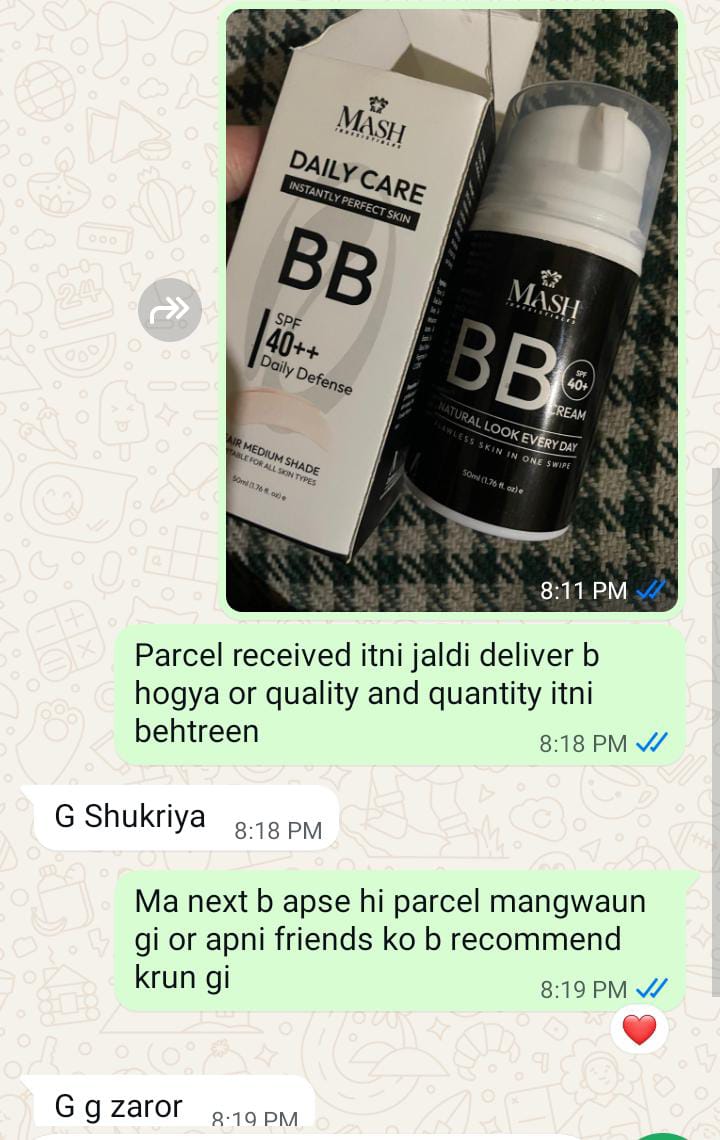 Mash BB cream usage ny Meri skin ko bht achi coverage provide ki even k dark circles b cover hogye or sun ki wajha se Meri skin py Jo tanning horhi thi vo b dour hogai ha kiun k is Bb cream ny sun protection bht achi di Meri skin ko or skin ko nourish b rakhti ha ye Bb cream to is liy Meri trf se HIGHLY RECOMMENDED ha
